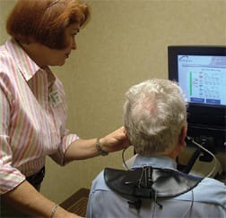 Hearing specialist Kate Maen conducts a computerized hearing exam.