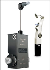 The Perkins Hand-Held Applanation Tonometer is portable, making it easier to examine bedridden and pediatric patients. Based on Goldmann principles and utilizing the original Goldmann or Tonosafe-disposable prisms, the Perkins combines proven technology with the flexibility of a handheld instrument. The Goldmann Applanation Tonometer is on the left side of the figure and the Perkins Tonometer appears on the right.