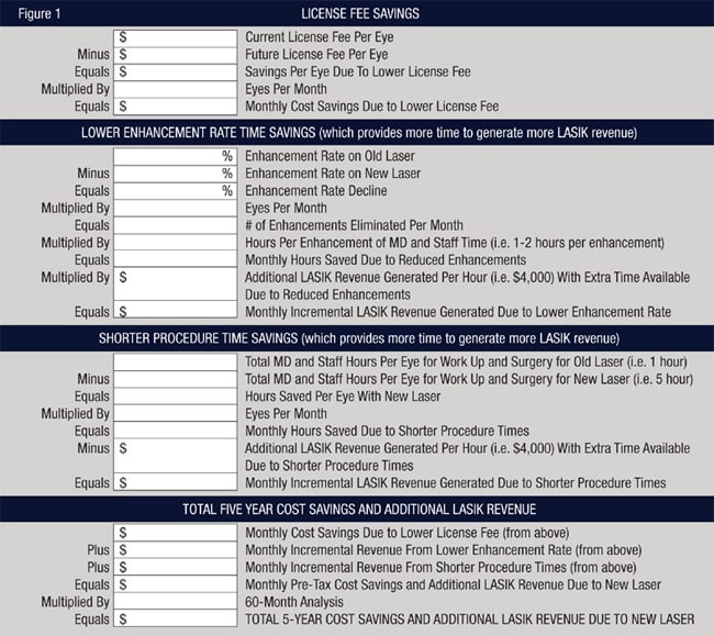 Variable costs consist of staff and the expenses associated with running the surgical suite. So you'll need to factor in the staff time required to perform each laser procedure. "As your surgical volume increases, those costs will rise because you'll need more help from your staff to maintain efficiency," says Steven R. Robinson, C.O.E., O.C.S., Advantage Administration, Dallas. (See Figure 1 to compare the variable costs of your current laser to your future laser.)