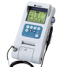 ■ The Tomey SP-100 hand-held portable pachymeter has a built-in printer, does IOP calculation and is network ready. Measurements are simple and quick using the Tomey tone-assisted measurement system. The SP-100 delivers up to 160 readings in just seconds, displaying average and standard deviation for more accurate results. The SP-100 IOP calculation nomogram can be adjusted by the user as technology evolves. The easy-to-read printout includes all the patient data as well as all the measurement results. Angled, straight and disposable probes are available.