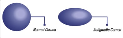 Figure 1. Normal cornea (left) is shaped like a basketball, in which both axes are equal. Astigmatic cornea (right) is shaped like a football, in which one axis is steeper than the other.