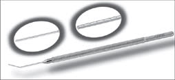 ■ The Henry 24g millimeter ruler, developed in coordination with Michael M. Henry, M.D., slides easily through a 1 mm paracentesis and is configured like a spatula for easy and effective sweeping of the iris and manipulation of a nucleus. The shaft is strong enough to be used as a rotator, as well as for manually dissecting a nucleus. The anterior surface contains 10 dimples spaced exactly 1 mm apart. The fifth dimple is larger than the others for quick and easy reference to a 5 mm distance, making it ideal for measuring the size of a capsulorrhexis. Because the new accommodative lenses are capsulorrhexis-size dependent, the Henry ruler solves the guesswork in sizing the rhexis, says Rhein.