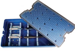 The E7421 Retina Sterilization Tray holds five retina handles, five retina tips and up to 15 additional instruments. This double-layer sterilization tray securely holds retinal handles and tips in bottom layer. In addition, the tray contains place-holders for the Retinal Tip Identification System.
