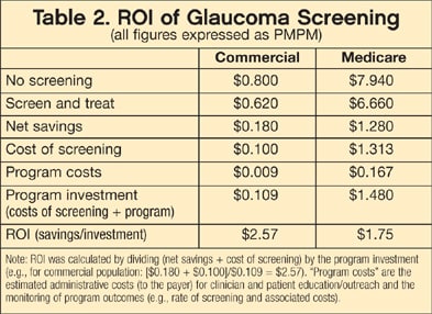 From a payer perspective, positive return on investment (ROI) for screening and care management programs has generally been limited to those directed at congestive heart failure or multiple disease conditions.39 However, in a model to evaluate the potential ROI of a glaucoma-screening program in commercial vs. senior member populations, we demonstrated a potential positive ROI in both managed-care populations.40 In a commercial population, total annual costs to "screen and treat" vs. a strategy of not screening were $0.62 per member per month (PMPM) vs. $0.80 PMPM respectively (a net savings of $0.18 PMPM in favor of screening). In a senior population, these costs were $6.66 PMPM vs. $7.94 PMPM, respectively (net savings of $1.28 PMPM in favor of screening). With estimated program costs of $0.009 PMPM and $0.167 PMPM in the commercial and senior populations, respectively, the estimated ROI was $2.57 and $1.75 for these programs (see Table 2). The positive ROI values can be explained by the significant differences in annual costs by stage of disease and the relatively modest costs associated with a glaucoma screening program.