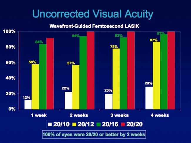 With wavefront-guided femtosecond LASIK, all eyes in this study were 20/20 or better by 2 weeks post-op.