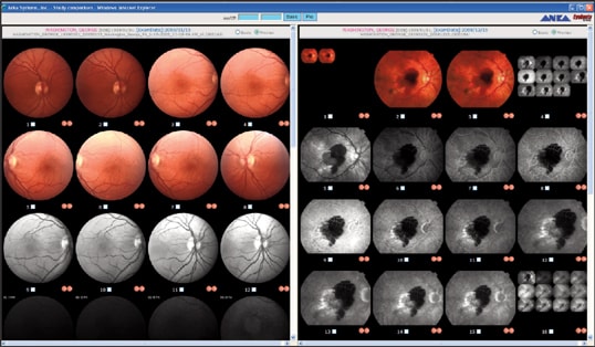 ■ Compare test results from different visits. There are several different ways to look at data over time, which is one of the strengths of the EyeRoute system. For example, with a few clicks of the mouse, I can view a patient's fundus photographs from an exam in 2005 on the left side of the screen and fundus photographs from an exam earlier this year on the right (Figure 1).
