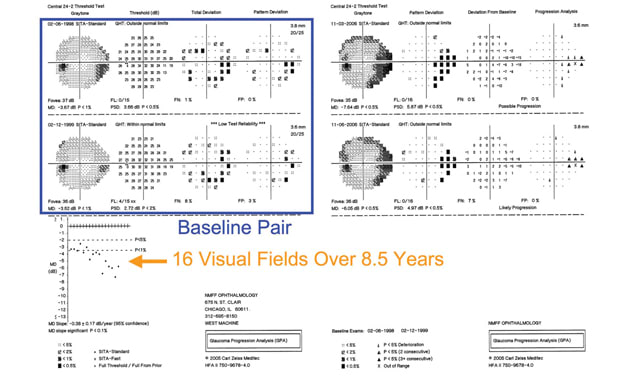 To reduce subjectivity in assessing glaucoma progression, several technologies are being used. Carl Zeiss Meditec introduced the Humphrey GPA (Glaucoma Progression Analysis, Carl Zeiss Meditec, Dublin, Calif.) in 2005 for the Humphrey Field Analyzer, based on the Early Manifest Glaucoma Trial. The GPA printout helps clinicians see at a glance whether there is evidence of visual field progression.