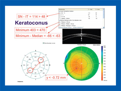 The pachymetry map produced by RTVue-100 also provides much more information for diagnosing keratoconus and forme fruste keratoconus. It's important to rule out these conditions in the preoperative evaluation of prospective LASIK patients. Several diagnostic parameters capture the characteristics of keratoconus and offer good diagnostic accuracy. To detect the asymmetric thinning that's typical of keratoconus, look at the difference between the inferotemporal and superonasal octants, and the difference between the inferior and superior octants. Keratoconus eyes typically have a thinner minimum thickness. The minimum minus median thickness is an even more specific parameter that reveals focal thinning rather than general thinning.