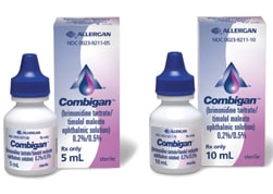 Allergan■ Combigan (brimonidine tartrate/timolol maleate ophthalmic solution) 0.2%/0.5%, an alpha adrenergic receptor agonist with a beta adrenergic receptor inhibitor, is a b.i.d. prescription eye drop indicated for the reduction of elevated IOP in patients with glaucoma or ocular hypertension who require adjunctive or replacement therapy due to inadequately controlled IOP. The IOP-lowering of Combigan ophthalmic solution dosed b.i.d. was slightly less than that seen with the concomitant administration of timolol maleate ophthalmic solution 0.5% dosed b.i.d. and brimonidine tartrate ophthalmic solution 0.2% dosed t.i.d. Combigan works in two ways to lower IOP with the IOP-lowering efficacy of two proven agents in the convenience of one bottle.
