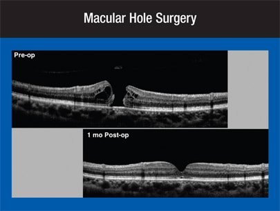 Figure 14. The RTVue-100 shows preoperative and postoperative macular hole size, which may help us predict the treatment outcome for this patient.