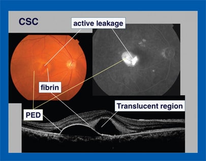 In a case of CSC, the RTVue-100 enables us to see exudation and, with the use of a B-scan, the translucent area as well. These cases almost always present with a translucent region. One case of CSC involved a patient who had the disease more than 5 years and presented with visual acuity of 20/200. The detached retina was somewhat thin. The lack of structure in the outer retinal layer suggested a poor visual prognosis.