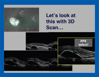 In cases of CSC, we've always spent a good deal of time locating the bulging of the lesion. Now, we can locate it easily by moving a cursor. Using the 3-D mode, we can view the bulging, the small lesion and the leakage. We can see what we need to see even after several weeks, as the lesion becomes more diffuse.