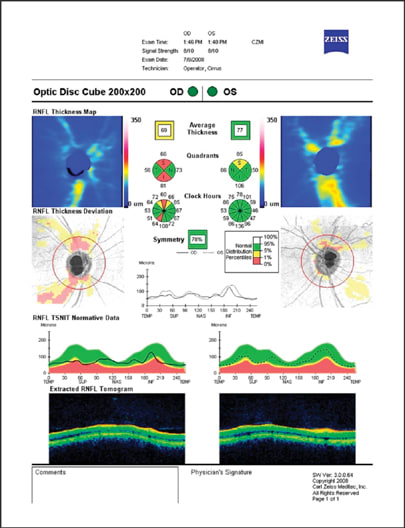 Although our clinical exam and early ancillary testing in this patient led to a possible diagnosis of glaucoma — at least in one eye — it was Cirrus HD-OCT that helped us make the diagnosis for both eyes. Cirrus HD-OCT illustrated the extent of glaucomatous damage by providing crystal clear views of RNFL thinning. Specifically, the Cirrus confirmed that the patient's right eye had greater RNFL loss and deviation from the norm than the left eye. Based on these findings, we diagnosed our patient with early open-angle glaucoma in both eyes. As a result of Cirrus HD-OCT technology and a solid diagnosis, we prescribed IOP-lowering medications in both eyes to slow the progression of optic nerve damage. OM