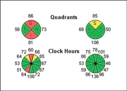Since most glaucoma diagnoses present with localized defects, the quadrant analysis of Cirrus HD-OCT can be very helpful. When we analyzed each quadrant of our patient, it was clear that he had superior and inferior RNFL loss in the right eye that was outside normal limits. His RNFL thickness in these quadrants was in the red zone, indicating that his RNFL was in the lowest 1% of age-matched controls. Surprisingly, we found there was also some possible RNFL loss superiorly in his left eye, as indicated in the yellow zone (Figure 2).
