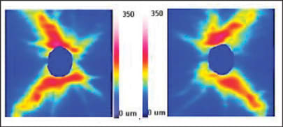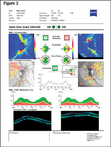 The RNFL thickness map is the centerpiece of the readout. The RNFL layer is segmented in the 6 mm × 6 mm cube, and the display schematically shows the nerve fiber layer's pattern and thickness (Figure 1). This is the image to show patients, because it's the easiest for them to understand. For comparison, I keep a scan of a normal eye in a folder in each exam room.