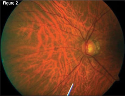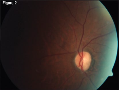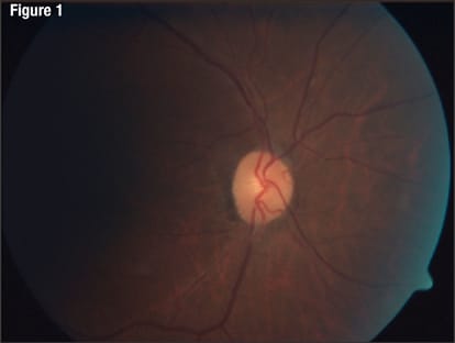A 74-year-old black man presented with decreased vision and was told he might have cataracts. The patient's visual acuities with pinhole were 20/20 in both eyes. His intraocular pressures by applanation were 25 mm Hg OU. The patient's pachymetry readings were 602 microns in the right eye and 597 microns in the left eye. Cup-to-disk ratios were 0.2 in both eyes (Figure 1 and Figure 2). The size of the patient's optic nerve in the right eye was 2.28 mm; the size of the optic nerve in the left eye was 2.18 mm.
