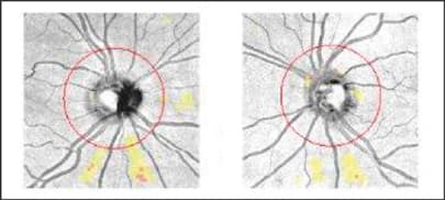 The RNFL thickness deviation map displays OCT fundus images (Figure 2). This is an en face view of the cube of OCT data. A colored overlay shows areas of RNFL thickness that deviate from the norm, based on the age-matched normative database. Deviations found in this area are of clinical significance if they're extensions of deviations within the circle. Otherwise, in my experience, they're not indicative of glaucoma.