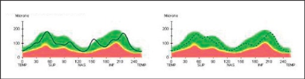 An auto-centration feature identifies the center of the cup and makes a 1.73-mm radius circle around it. The circle is shown as a red line superimposed on the deviation map. The software identifies the center of the disk automatically post-acquisition. Because the center will be in the same place in a repeat scan, no technician-related error (improperly outlining the optic nerve head) can occur. From this 3.4-mm diameter circle, the RNFL tomogram is extracted and forms the basis for the TSNIT analysis. This is compared to the normative database and is displayed graphically (Figure 3).