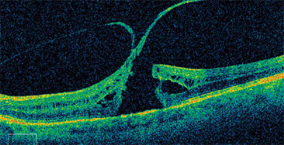 Figure 3. High-definition OCT shows vitreomacular traction with the appearance of a possible macular hole post cataract surgery.