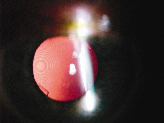 Figure 1. The Tecnis Multifocal, shown here implanted, has a full diffractive posterior surface and a wavefront-designed aspheric anterior surface. The FDA is reviewing data from a multicenter clinical study, involving 13 investigators and approximately 250 patients who received bilateral monofocal IOLs or bilateral Tecnis Multifocal IOLs. At one year, the Tecnis Multifocal patients had statistically significant better reading acuity and speed compared with the monofocal patients. Among the more than 100 patients who were bilaterally implanted with the Tecnis Multifocal, a high percentage reported they were able to function comfortably without eyeglasses at all distances (Figure 2). In addition, 94.6% of Tecnis Multifocal patients reported that they would choose the lens again (Figure 3).