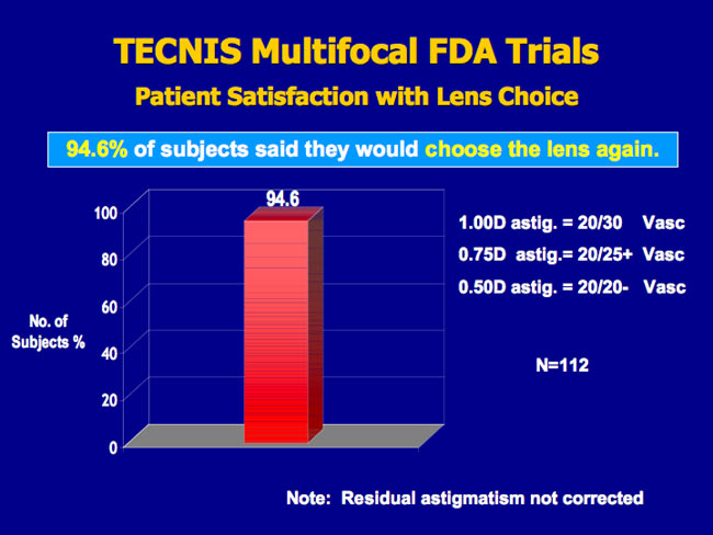 Figure 3. In the multicenter clinical study presented to the FDA, 94.6% of patients who received bilateral implantations of the Tecnis Multifocal IOL said they would choose the lens again. Screening, Selection Simplified As part of the FDA clinical trials for the Tecnis Multifocal IOL, I've treated approximately 30 patients, and the results have been extremely gratifying. All of the patients are enjoying minimal or no dependence on eyeglasses and have excellent quality of vision with minimal complaints. The combination of multifocality and asphericity in one IOL is good news for experienced and new surgeons alike. Because these new lenses are a better option for just about every patient, the screening and selection process is simplified. And even more importantly, they go a long way toward our ability to ensure complete satisfaction for the growing number of patients who seek spectacle independence. References