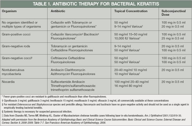 The table below shows the AAO's recommendations for antibiotic therapy for patients with bacterial keratitis.1
