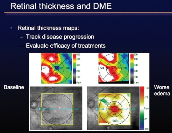 In contrast to FA, the macular thickness maps generated by OCT correlate very well with other key features of DME. Increased thickening on the maps corresponds to clinical leakage, fluorescein leakage and decreased vision.1-3 As retinal thickness increases, visual acuity worsens.
