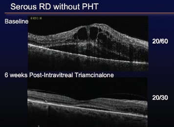 Figure 4. After a steroid was used to treat this serous retinal detachment with no posterior hyaloid traction in an eye with DME, the amount of fluid and the retinal thickness decreased. Visual acuity also improved.