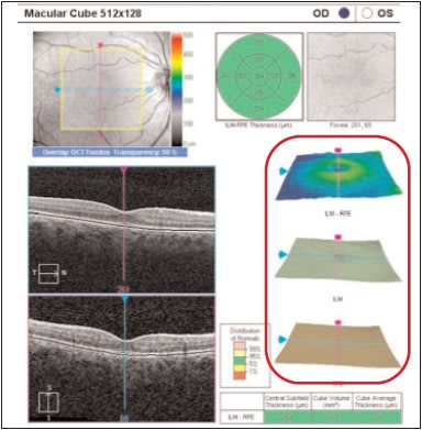 The information, of course, is represented for us on a printout. The printout for the dense macular cube scan (512 x 128), for example, includes the horizontal and vertical B-scans. It also includes 3-D segmentation maps of the ILM and the RPE (Figure 1). The segmentation techniques also make it possible to reconstruct 2-D and 3-D thickness maps (Figure 2).