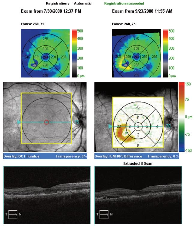 The patient is an 82-year-old woman with AMD. At one particular visit, a small cyst was visible on the Cirrus HD-OCT scan. To determine if fluid had accumulated since her previous visit, we checked the Macular Change Analysis. It showed no change, so we decided to observe. When the patient returned 8 weeks later, Macular Change Analysis detected a slight increase in the amount of macular fluid. Again, we elected not to treat but to have the patient come back in approximately 2 weeks. During the subsequent visit, the macular change difference map clearly identified a large area of increased fluid. We treated with an intravitreal injection of ranibizumab (Lucentis, Genentech). When the patient returned a month later for follow-up, the difference map indicated the fluid had diminished.