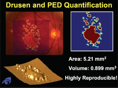 In addition, if we think of serous PEDs simply as RPE deformation that are similar to drusen, then we can see why the same algorithm that quantitates drusen in dry AMD will also provide reliable and reproducible measurements of PEDs in wet AMD (Figures 17-18).
