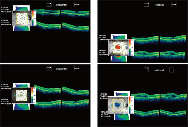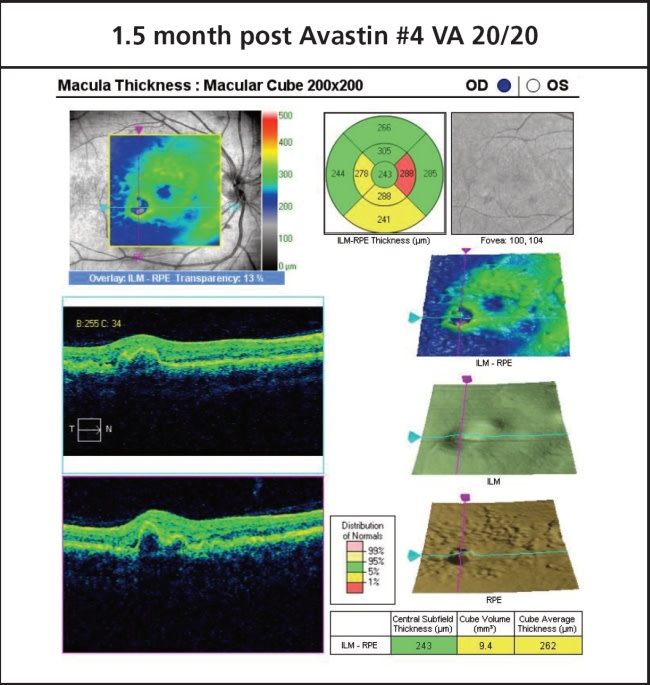 One month later, when the patient returned for scheduled follow-up, the thickness maps indicated the amount of macular fluid had decreased. The elevation was less and the horizontal and vertical B-scans showed the PED was smaller. However, some fluid was still present. From this point, we treated the patient with three additional injections of bevacizumab at scheduled intervals.