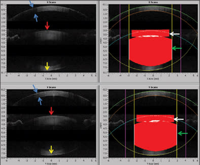 Figure 1. OCT detection of dimensions of anterior chamber and position of anterior and posterior capsule with physician-directed placement of capsulotomy and lens softening-segmentation cuts. Real-time OCT detection of anterior and posterior surfaces of cornea (blue arrows), anterior surface of the lens (red arrows), posterior surface of lens (yellow arrows), planned position and diameter of anterior capsulotomy (white arrows), and the position and depth of the lens segmentation and softening (green arrows).