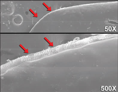 Figure 4: Electron microscopy of edge of femtosecond laser-cut human anterior lens capsule showing smoothness of the cut (red arrows) comparable to manually created anterior capsulorhexis.
