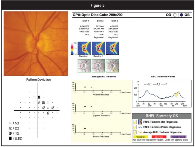 Figures 4 and 5. Using new Cirrus HD-OCT software for detection of glaucoma progression, clinicians can quantitatively assess images and progression in the RNFL and optic disc. In these cases, changes in the RNFL and optic disc are visible before changes in other parameters.