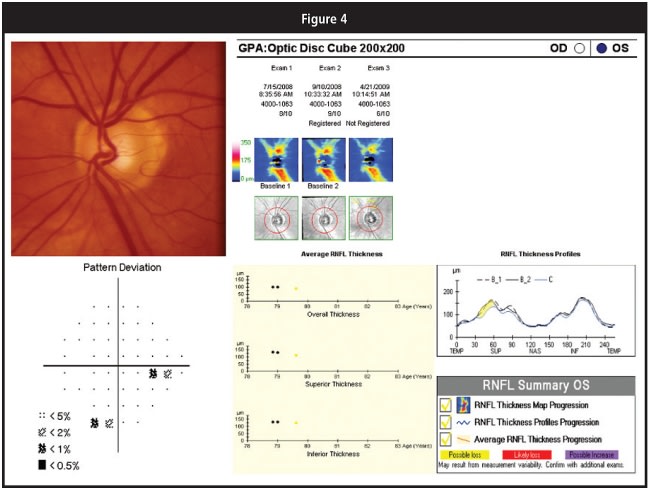 Cirrus HD-OCT is also equipped with GPA software for detection of glaucoma progression. Clinicians can quantitatively assess images and look for disease progression in the RNFL and � in the future — in the optic disc. The following two cases show detection of disease progression that occurred in a relatively short period.