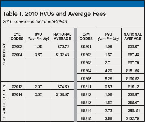 92012 vs. 99213. For return office visits for conditions requiring more frequent exams, the choice is often between CPT codes 99213 and 92012. An error was made in the RVU calculation in 1998, and the erroneous calculation has been pretty much maintained. This has resulted in significantly higher reimbursement for code 92012 in 2010 — $9.02 more in 2010 on a national average. Given the choice, the eye code pays better than the E/M code and can be pretty much used in most instances.
