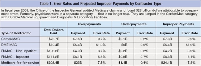 The accompanying table (below) shows how CMS fared when audited for 2009 by the OIG. Medicare was found to have improperly paid over $23 billion to all types of providers. Physicians are probably the least of the categories that caused this; however, they make easy targets because they are personally responsible for providing a huge amount of complex documentation and often don't take the time to learn what is required of them.