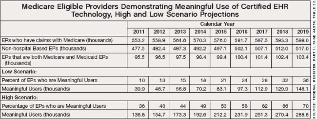 The rule has 25 criteria that may apply, with the option for a provider to defer up to five of the criteria with certain restrictions.10 Medicare expects that by 2019 between 36% to 70% of EPs will demonstrate "meaningful use."11 (For a discussion of the objectives/measures that physicians must fulfill, see the "Path to Paperless" column in OM's September issue.)