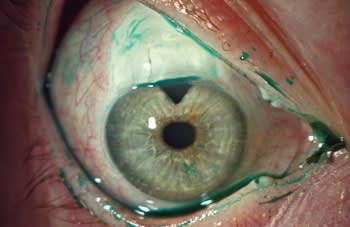 Figure 1. Lissamine green staining of cornea and bleb in patient with OSD and bleb dysthesia.