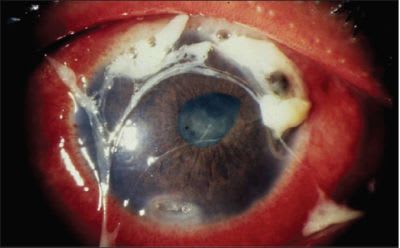 Figure 2. Severe hyperpurulent conjunctivitis with consecutive keratolysis and perforation due to Neisseria gonorrhea.
