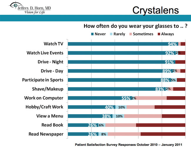 Figure 2. Patients expressed the highest level of satisfaction for Crystalens, compared to other IOLs, despite the fact that other lenses offered greater spectacle independence. As part of the education process, patients accepted this level of spectacle use before deciding on an IOL. Surgery met or exceeded their expectations, even with reading glasses.