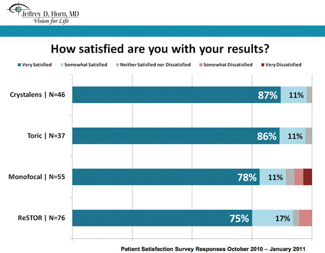 When I reviewed the latest results, I evaluated 214 surveys returned between October 2010 and January 2011. Almost all patients were satisfied, but advanced technology lenses beat basic lenses. Of patients who received basic IOLs, 89% were very or somewhat satisfied with the surgical results. That number increased to 92% for Restor, 97% for toric lenses and 98% for Crystalens patients.