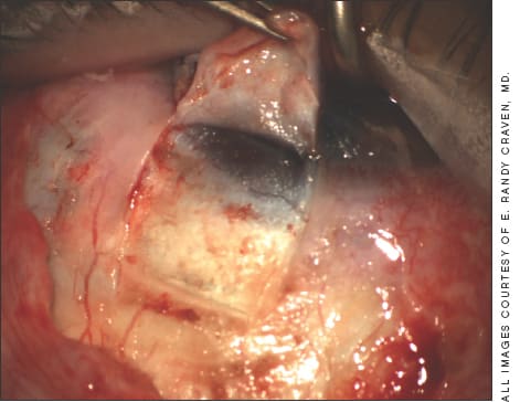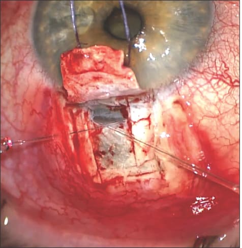 Figure 8. Here, the Prolene knots can be seen, as well as some blood between the Descemet's window and the scleral flap.