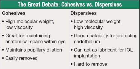 Cohesives, explains Dr. Colvard, behave like a jelly when they're under zero shear. Excellent for maintaining space, they work well within the eye for IOL implantation. “Dispersives tend to be like honey at zero shear. They're a little runnier and don't maintain space as well. However, under high shear during irrigation and aspiration, they tend to stay in the eye, coat tissues and protect the cornea,” Dr. Colvard says. “For a dense nucleus or eyes with endothelial dystrophy, I like to use Alcon's Viscoat to protect the corneal endothelium.”