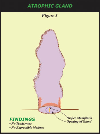 • Complete Proximal Obstruction and Complete Distal Obstruction. Lid tenderness may exist over the whole or part of a lid, from presumed elevated meibomian gland intraductal pressure secondary to obstruction with concurrent intact meibum production. We therefore refer to the glands within these lids as having a complete obstruction. If a gland shows expressible meibum, the complete obstruction must be deeper in the lid, which is proximal to the distal glands allowing some meibum to be expressed. If this tender lid has five glands expressible, then we describe it as “complete proximal obstruction or CPO (Figure 1).” If no meibum is expressible from at least five glands in a lid, the glands in the lid have a “complete distal obstruction or CDO” (Figure 2), indicating the complete obstruction is near the level of the orifice and glands are not able to secrete meibum to reach the orifice and lid margin. On lid transillumination, CPO could lead to short glands and loss of acinar-ductal units while CDO could lead to dilated ducts, and cystic acini with subsequent diffuse acinar atrophy and ultimate loss of whole glands.