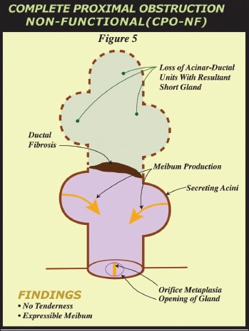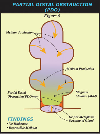 • Partial Distal Obstruction and Complete Distal Obstruction-NonFunctional. Lids without tenderness may or may not have at least five glands with expressible meibum. If a lid has at least five glands with expressible meibum and orifice metaplasia, but no lid tenderness, it is described as having a “partial distal obstruction or PDO” while a lid without expressible meibum from 5 glands and no lid tenderness is a “complete distal obstruction-nonfunctional or CDO-NF. In this case, meibum is not expressible so the obstruction is complete and distal. It is proposed that the glands are not generating meibum sufficient to elevate intraductal pressure causing lid tenderness.