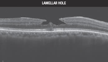 | A 60-year-old man is evaluated for decreased vision in his left eye for several months. His visual acuity is 20/60, and he has distortion on Amsler grid testing. On clinical examination, this patient appears to have a macular hole. Imaging with the Cirrus SD-OCT in high-definition 5-line raster mode (Figure 2) reveals a thickened irregular ERM on the temporal (right) side of the scan. A defect in the inner retina becomes continuous, with a splitting between the retinal layers. This is not a full thickness defect, however, and outer retinal tissue remains intact. The diagnosis in this case is a lamellar hole. We do not have good longitudinal data on lamellar holes, but our clinical experience is that they can remain stable or they can slowly enlarge over time, and it is currently unclear which signs are suggestive of progression and further vision loss in a specific patient. The general consensus in the retina community is that surgery offers no benefit, and this patient was observed.
