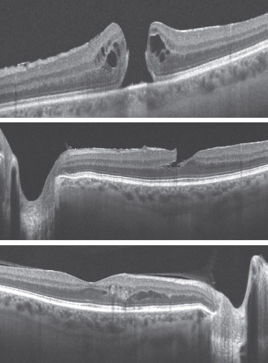 Figures 3 to 5. During preoperative assessment watch for conditions such as macular hole (top image), macular pucker (center) and diabetic macular edema (bottom).
