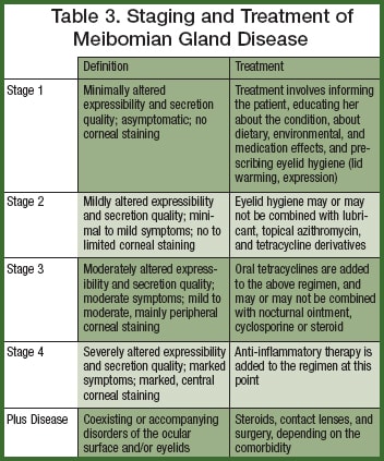 The dry eye guidelines and levels that have been developed in recent years go a long way toward helping to better serve our dry eye patients. The new guidelines for the treatment of meibomian gland disease will also help us diagnose and treat those patients with a mixed mechanism dry eye process (Table 3). The bottom line is that the ability to identify and properly classify dry eye patients will allow us to provide the best care possible. ■